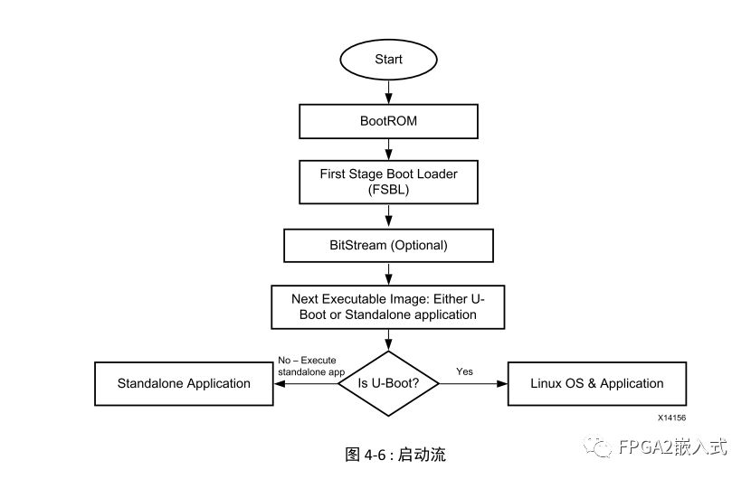 在为SoC 加电时,启动过程从BootROM 开始。启动过程先从片上储存器 (OCM) 加载然后启动执行第一阶段启动加载器 (FSBL)。FSBL负责配置具体的初始化。