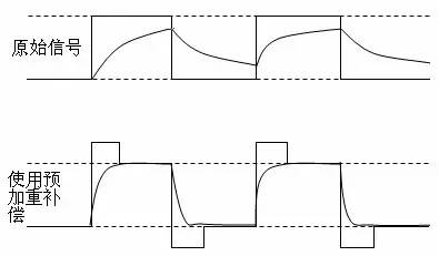 前面已经介绍过了,信号传输线表现出来的是低通滤波特性,传输过程中信号的高频成分衰减大,低频成分衰减少。预加重技术的思想就是在传输线的始端增强信号的高频成分,以补偿高频分量在传输过程中的过大衰减。我们知道,信号频率的高低主要是由信号电平变化的速度决定的,所以信号的高频分量主要出现在信号的上升沿和下降沿处,预加重技术就是增强信号上升沿和下降沿处的幅度。如下图所示。
