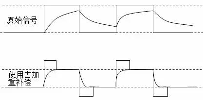 去加重技术的思想跟预加重技术有点类似,只是实现方法有点不同,预加重是增加信号上升沿和下降沿处的幅度,其它地方幅度不变;而去加重是保持信号上升沿和下降沿处的幅度不变,其他地方信号减弱。如下图所示。
