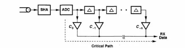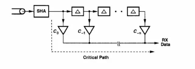 数字 FIR 滤波器 :接收端 FIR 滤波器也可以与发射端预加重 FIR 滤波器类似的方式实现。由于 发射端处理的是离散信号,其 FIR 滤波器可以实现为数字滤波器。然而,离散信 号经过有损信道之后会出现扭曲,到达接收端时候成了模拟信号,因此接收端滤 波器应该在模拟域(Analog Domain)中实现。如图为数字 FIR 滤波器的实 现框图。其中采样保持放大器(SHA)对信号进行采样,样本再由模数转换器(ADC) 转换成数字信号。但由于乘法运算通常在数字域中实现,功耗很大。
