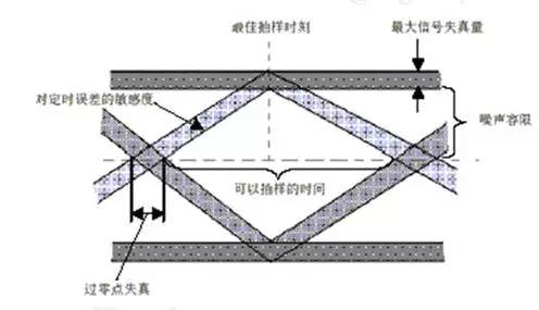 通常眼图可以用上图所示的图形来描述,由此图可以看出:(1)眼图张开的宽度决定了接收波形可以不受串扰影响而抽样再生的时间间隔。显然,最佳抽样时刻应选在眼睛张开最大的时刻。(2)眼图斜边的斜率,表示系统对定时抖动(或误差)的灵敏度,斜率越大,系统对定时抖动越敏感。(3)眼图左(右)角阴影部分的水平宽度表示信号零点的变化范围,称为零点失真量,在许多接收设备中,定时信息是由信号零点位置来提取的,对于这种设备零点失真量很重要。(4)在抽样时刻,阴影区的垂直宽度表示最大信号失真量。(5)在抽样时刻上、下两阴影区间隔的一半是最小噪声容限,噪声瞬时值超过它就有可能发生错误判决。(6)横轴对应判决门限电平。