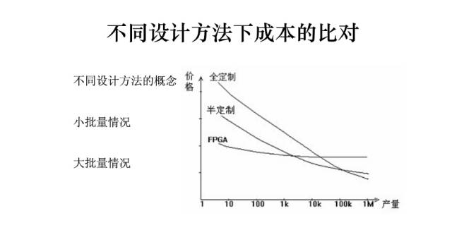 从设计成本来考虑,小批量上FPGA占优,大批量时,ASIC占优。
