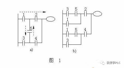 02能流如图1所示触点1、2接通时,有一个假想的“概念电流”或“能流”(Power Flow)从左向右流动,这一方向与执行用户程序时的逻辑运算的顺序是一致的。能流只能从左向右流动。利用能流这一概念,可以帮助我们更好地理解和分析梯形图。图1a中可能有两个方向的能流流过触点5(经过触点1、5、4或经过触点3、5、2),这不符合能流只能从左向右流动的原则,因此应改为如图1b所示的梯形图。