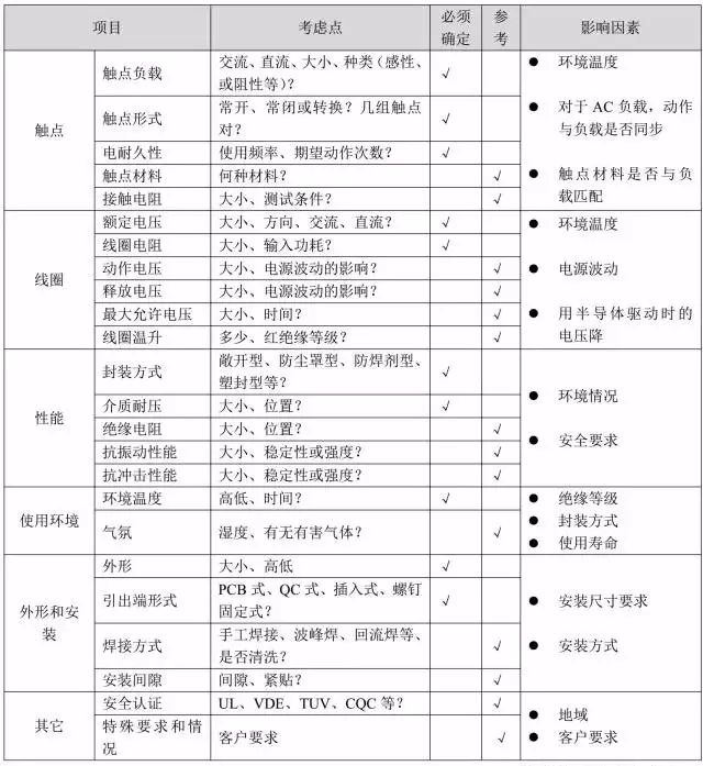 为了正确的选用继电器,需要了解继电器的特性,确认这些特性是否符合使用要求,如能在实际使环境中进行确认则更为可靠。继电器的选用原则参见表 1,在表中“必须确定”栏中有“”号的项目被确定之后,就可选定一款继电器。如果有进一步的要求,需要进一步考虑“参考”栏中有“”号的相应项目。