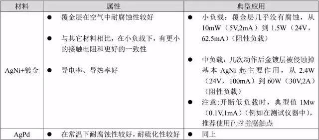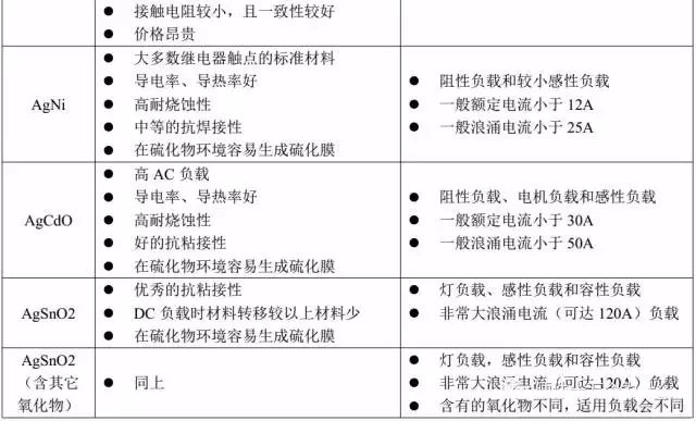 1.2 触点材料对于同一款继电器,不同的触点材料所适用的负载种类或范围略有不同。见表 3。
