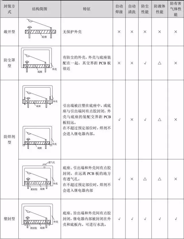 备注:(1)“√”:好;“×”:不好;“△”:注意;(2)由于塑料具有一定的透气率,所以在有有害气体或要求防爆的情况下请使用密封型继电器。3.2 介质耐压和绝缘电阻请确认这两项参数能满足使用要求,而不会导致线路发生击穿、短路等情况。3.3 抗振动和抗冲击性能请确认这两项参数能满足使用要求,而不会导致继电器在使用过程中发生失效。4 使用环境4.1 环境温度一般在环境温度不超出说明书中所规定的范围时, 继电器均可正常工作。4.2 气氛在较大湿度、甚至会凝露,以及粉尘多的环境下,推荐使用塑封型继电器,因为较大的湿度易加速继电器结构零件的锈蚀,粉尘则易使继电器触点失效。在含有机硅的环境下,推荐使用密封型产品,因为有机硅会使继电器加速触点失效。在含 H2S、 SO2、 NO2 等有害气体的环境下,不能使用防焊剂型和防尘罩型,可用塑封型,并在实际使用中进行试验确认。在实际使用中,如果环境气氛比较好,那么推荐使用防尘罩型或防焊剂型继电器,因为防尘罩型或防焊剂型继电器可获得较塑封型更长的电耐久性。5 外形和安装5.1 外形和安装间隙一般继电器的外形尺寸都有一定的公差,因此在设计电路和安装间隙时,推荐按说明书中规定的最大尺寸进行设计5.2 焊接方式选择继电器的引出端均不含铅,推荐焊接温度和时间为: 240℃~260℃, 2s-5s。若需要进行回流焊,请确认说明书是否说明该款继电器可以进行回流焊。5.3 引出端形式可根据实际情况选择合适的引出端形状(表 6)和安装方法(表 7)