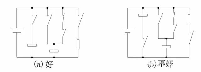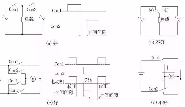 应避免因触点粘接、电弧导致的短路在电路中,应考虑以几点(参见图 4):1) 一般继电器的触点间隙都比较小,应考虑到可能由于触点间电弧引起短路的情况。请不要使用图 4(b)的电路。推荐使用图 4(a)所示电路,并在触点 Con1 和 Con2 动作之间设定一定的间隔时间。2)应该考虑在触点间粘接或错误动作造成短路时,也不应产生过电流,造成电路超负荷或烧损。3)注意不要使用图 4(d)所示的用两组转换触点构成电动机正、逆转电路。推荐使用图 4(c)所示电路,并在触点 Con1 和 Con2 动作之间投定一定的间隔时间。