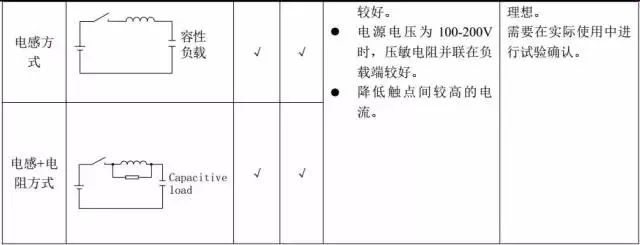 一般,触点的材料转移是由于大电流的单向流动或者容性负载的冲击电流造成,多发生在直流电路,一般表现为阳性凸、阴性凹的形状。因此适当使用触点保护电路、或使用抗材料转移较好的 AgSnO 触点,可缓解触点的材料转移现象。对于大容量的直流负载(数 A~数十 A),必须在实际应用中试验确认。1.3.3 触点的保护电路一般感性负载比电阻性负载更容易使触点受到损作,如果使用适当的保护电路可以使感性负载对触点的影响与电阻性负载基本相当,但请注意如果不正确使用,可能会产生反效果。表 7 是触点保护电路的代表性例子。