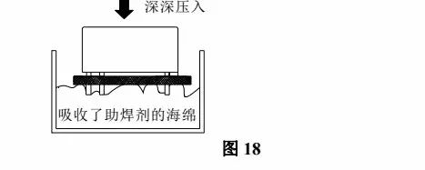 5.7.2 涂抹助焊剂助焊剂请使用非腐蚀性的松香类系列,溶剂请使用化学作用较少的酒精。请薄而均匀的涂抹助焊剂,以防止其浸入继电器内部。对于蘸式涂抹,请保持助焊剂液面稳定。请调整位置使助焊剂不会溢到印制板的上面。请注意不要使助焊剂附着在继电器端子以外的部位,这样可能导致继电器的绝缘降低。请注意对于防尘罩和防焊剂型继电器,不要使用将印制板从上方深深按入蘸有助焊剂的海棉里的涂抹方式,如图 18 所示,这种方式会使助焊剂进入继电器内部。特别要注意的是防尘罩型。