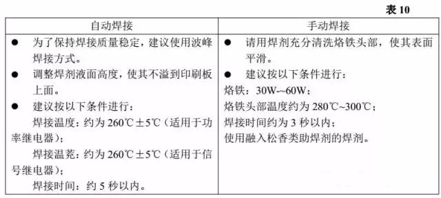 5.7.3 预热为了改善焊接性能,请务必进行预热。请在温度为 100℃以下(印制板焊接面)、时间为 1 分以内的条件下进行预热。请注意不要使用因装置故障等原因而长时间放置于高温中的继电器,它们的初始性能可能己发生改变。5.7.4 焊接焊接注意事项见表 10