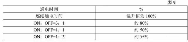 在继电器动作过程中,线圈会发热使其温度升高。一般在接通时间为 2 分钟以下的脉冲电压下使用时,线圈温升值与接通(ON)时间、及接通与断开(OFF)的比例有关,各种继电器基本相同,参见表 9。