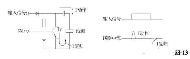 2.13.6 磁保持单线圈继电器的一种驱动电路如图 13 所示为磁保持单线圈继电器的一种驱动电路。当有输入信号时,电流给电容 C 充电,利用这一充电电流给线圈供电,使继电器动作,当去掉输入信号时,电容 C 上储存的电能通过三极管 Tr 和线圈 Coil 放电,使继电器复归。在使用该电路时,请在实际使用中确认电路参数。