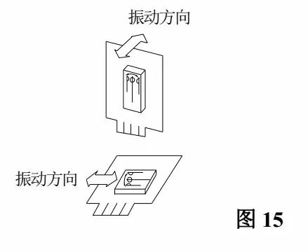 4.4.4 高温、高湿环境请注意继电器长时间(含运输期间)处于高温、高湿中时,触点表面易生成氧化膜,导致接触不稳定和触点故障,其它金属零件也容易发生氧化或锈蚀,从而产生功能障碍。4.4.5 表面贴装型(SMT 型)继电器的环境SMT 型继电器对湿度比较敏感,因而采用了防湿包装,保管时请注意以下几点:(1)防湿包装袋开封后,请尽早使用。(2)防湿包装袋开封后若需长期保管,建议使用有湿度控制的干燥器。5 外形和安装5.1 关于底视图与顶视图一般从继电器的 PCB 引出端面投影得到的是底视图,而从它的反方向(即继电器外壳顶面)投影得到的是顶视图。请在使用产品说明书和安装继电器时注意。5.2 安装方向除非另有说明,否则一般继电器的安装方向为任意方向,但为使继电器更为稳定和可靠的工作,安装方向也是需要良好考虑的。5.2.1 耐振动冲击性比较理想的安装方法是使触点的动作方向及衔铁的动作方向与振动冲击方向成直角。尤其是在线圈未通电的状态下,常闭触点的耐振耐冲击性较弱,如果安装方向适当将能保证它的性能。如图 15