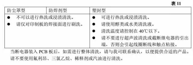5.7.5 冷却自动焊接之后,为了避免因焊接时的热量使继电器或其它部件老化,请在焊接后立即通风冷却。塑封型继电器虽然能够进行清洗,但在刚焊接完成时,请不要将继电器立即送去清洗,因为突然接触较凉的清洗液可能会损坏继电器内部的密封性。5.7.6 清洗清洗时请阅表 11 选择清洗方法。
