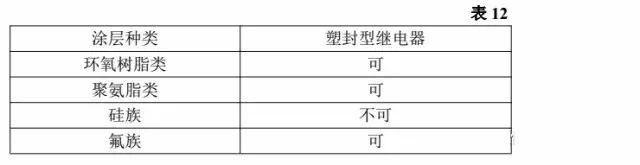为了防止印制板的绝缘劣化,需要进行表面处理时请注意以下事项。防尘罩型及防焊剂型,会因为表面处理剂进入继电器内部导致发生故障,因此请不要进行表面处理,或在表面处理之后再安装继电器。由于某此表面处理剂对继电器有不良影响,如溶解外壳等,因此请认真选择、并在实际使用时时行试验确认。表面处理剂的温度请不要超过继电器最高的使用温度,而且请在继电器冷至常温时,才能喷涂表面处理剂。关于涂层有以下建议,见表 12.