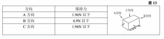 以下记述了将表面贴装型(SMT)继电器焊接在印制板上时的注意点,请作为实际使用时的参考。请注意不要在加工过程中损伤继电器。5.8.1 刷焊膏请选用松香类和不含氯的焊膏,因为氯可能导致继电器出脚和电路板腐蚀。请确认焊膏涂抹均匀,厚度为 0.15mm~0.2mm。5.8.2 安装在安装继电器时,除非说明书里另有声明,否则请将爪子的保持力高定在表 13 所规定的值以内。