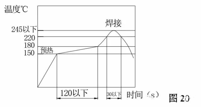 5.8.3 运输请确保在运输过程中,继电器不会因受到振动等因素而脱落,以避免因此产生的焊接不良。5.8.4 回流焊接图 20 显示了红外线回焊时印制板板面的温度曲线,但得各继电器的条件可能会有所不同,因此请参阅各继电器的说明书,如果说明书中没有声明,可以使用图示温度曲线。