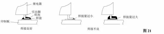在刚焊接完成时,请不要将继电器立即送去清洗,因为突然接触较凉的清洗液可能会损坏继电器内部的密封性。请不要将继电器浸渍在焊剂槽中,这样会使塑料变形导致继电器故障。焊接状态请参考图 21。