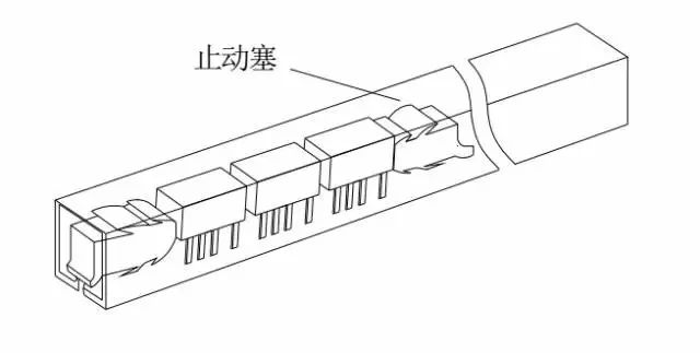清洗可进行热洗或浸渍清洗,清洗温度请控制在 40℃以下。请使用醇类或水类清洗液,而不要使用氟利昂、三氯乙烷、稀释剂或汽油进行清洗。请不要进行超声波清洗,否则会引起线圈断线和触点粘接。不当的焊接会导致断电器密封性能下降,此时避免对焊后继电器进行清洗或表面处理(浸涂保护剂)。6 其它注意事项6.1 安全上的注意点请注意在继电器正常工作时,如果用手触摸会有触电的危险。请注意在进行继电器(包括端子台、插座等连接部件)的安装、维护和故障处理时请先切断电源。请注意在进行端子连接时,请先对照产品说明书上的连接图,然后再正确连接。如果连接错误可能会引起无法预期的误动作、异常发热、着火等情况。如果发生触点粘接、接触不良、断线等不良时,会危害至其它财产,甚至生命时,请使用双重安全装置。6.2 长管状包装在使用长管关包装的继电器时,请不要摇摆包装管,使继电器受到冲击,这样可能导致继电器发生故障。如果该包装使用了止动塞,请将止动塞压入贴上继电器,避免继电器在包装管里晃荡。如图 22