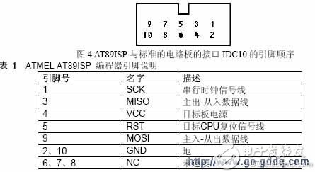 经常有人使用PROTEL 的标准库IDC10 来设计成编程器的引线接口,但是一般情况下都不知道如何去连接(那端为第一脚),为了您使用方便,我们提供了下图(图4),您只需要在设计电路板时添加以下接口即可方便地实现您的板子具有ISP 功能。