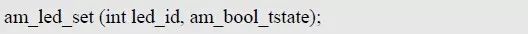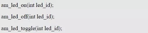 对于am_led_on、am_led_off 和am_led_toggle 接口来说,它们的职责单一,仅仅需要指定控制的LED,即可完成点亮、熄灭或翻转操作,无需额外的其它参数。因此对于这类接口,参数仅仅只需要led_id。其函数原型如下: