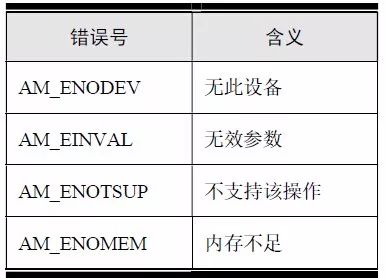 错误号在am_errno.h 文件中定义,几个常见错误号的定义详见表8.1。比如,在调用LED 通用接口时,若led_id 不在有效范围内,则该led_id没有对应的LED 设备,此时接口应该返回-AM_ENODEV。注意:M_ENODEV 的前面有一个负号,以返回负值。