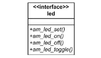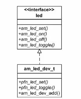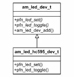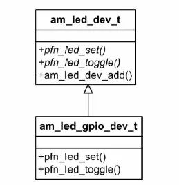 在使用不同方式控制LED 时,虽然它们对应am_led_set()和am_led_toggle()的实现方法不同,但它们要实现的功能却是一样的,这是它们的共性:均要实现设置LED 状态和翻转LED 状态的功能。由于一个接口的实现代码只能有一份,因此它们的实现不能直接作为通用接口的实现代码。为此,可以对它们的共性进行抽象,即抽象为如下两个方法: