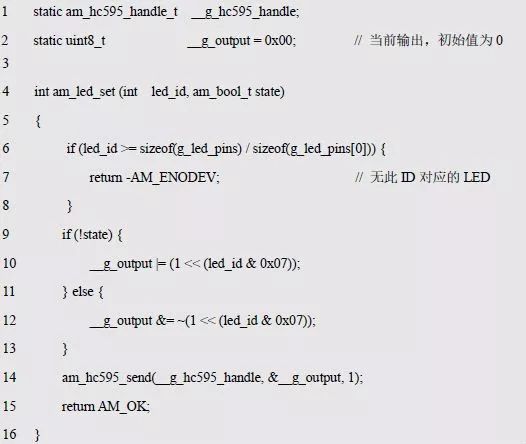 程序清单8.3 am_led_set()的实现(HC595 控制LED)