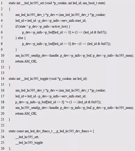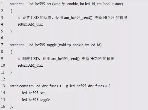 这里定义了一个虚函数表,包含了两个方法,分别用于设置LED 的状态和翻转LED。针对不同的硬件设备,都可以根据自身特性实现这两个方法。GPIO 控制LED 的伪代码详见程序清单8.4,HC595 控制LED 的伪代码详见程序清单8.5。