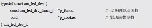 其中,p_funcs 为指向驱动虚函数表的指针,比如,指向__g_led_gpio_drv_funcs 或__g_led_hc595_drv_funcs,p_cookie 为指向设备的指针,即传递给驱动函数的第一个参数。