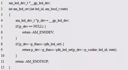 此时,在am_led_set()接口的实现中,无需完成真实的设置LED 状态的操作,仅需调用设备中的pfn_led_set 方法即可,其范例程序详见程序清单8.6。