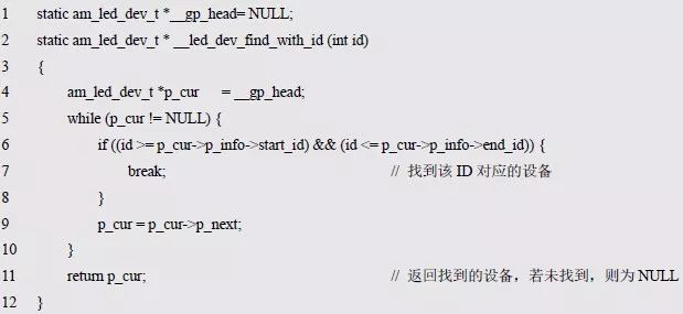 其中,__led_dev_find_with_id()的作用就是遍历设备链表,与各个设备中的ID 信息一一比对,以找到led_id 对应的LED 设备,其实现详见程序清单8.8。