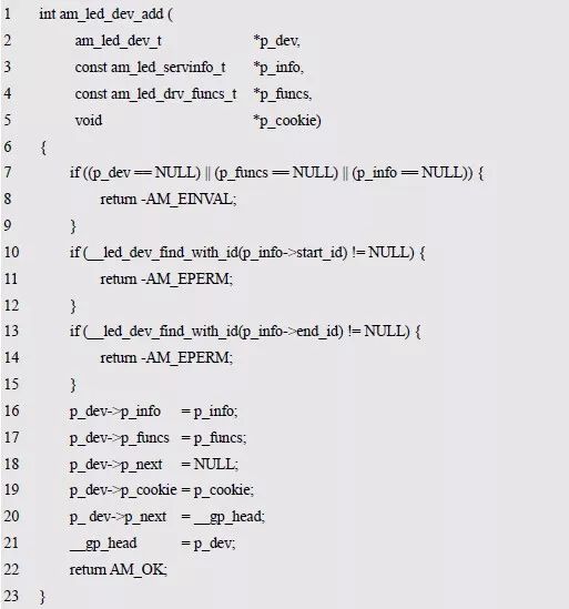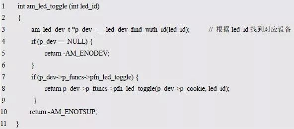 其中,__gp_head 是一个全局变量,初始为NULL,表示初始时系统中无任何LED 设备。同理,可得到am_led_toggle()接口的实现,详见程序清单8.9。