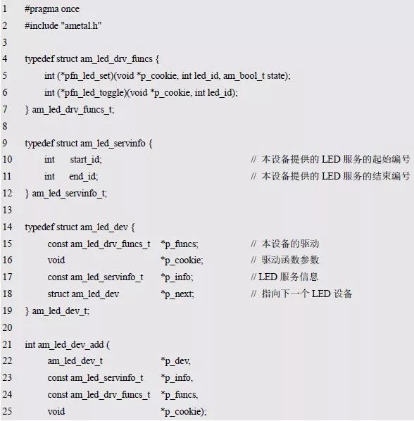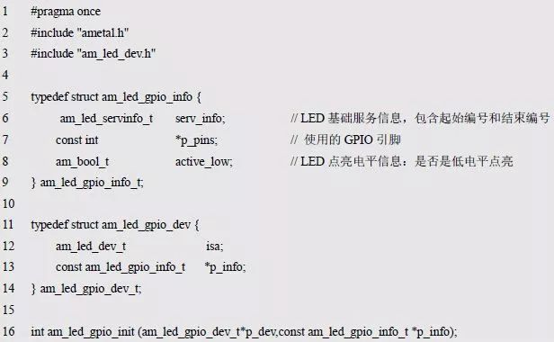 为了便于查阅,如程序清单8.14 所示展示了LED 设备接口文件am_led_gpio.h 的内容。