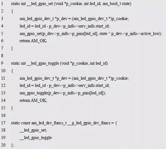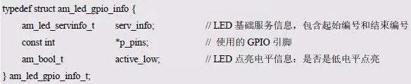 其中,p_dev 指向am_led_gpio_dev_t 类型的设备,p_info 为指向am_led_gpio_info_t 类型实例信息的指针,其调用形式如下: