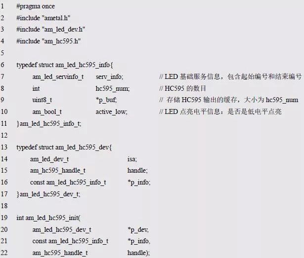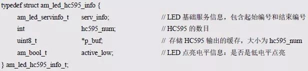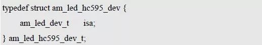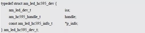 am_led_hc595_dev_t 为具体的LED 设备类,当具有该类型后,即可使用该类型定义一个具体的LED 设备实例: