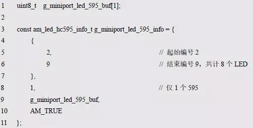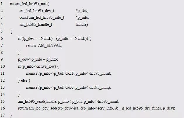 其中, p_dev 为指向am_led_hc595_dev_t 类型实例的指针, p_info 为指向am_led_hc595_info_t 类型实例信息的指针,其调用形式如下: