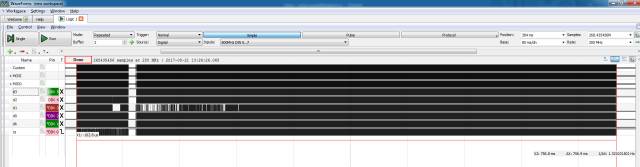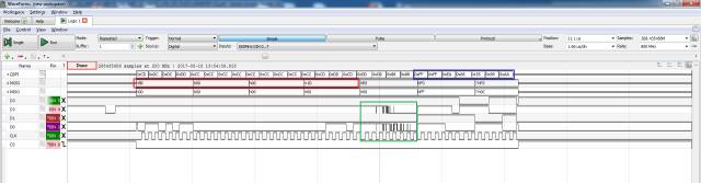 // rgData: input, raw digital sample array// rgValue: output, decoded data array// rgFlag: output, decoded flag arrayvar c = rgData.length // c = number of raw samplesvar pClock = false; // previous cock signal levelvar iStart = 0; // used to keep track on word start indexvar cByte = 0; // byte count per transmissionvar cBits = 0; // bit countervar bValue = 0; // value variablevar fCmd = true;for(var i = 0; i < c; i++){ // for each sample var s = rgData[i]; // current sample var fSelect = 1&(s>>0); // pin0 is the select signal var fClock = 1&(s>>1); // pin1 is the clock signal var fData = 1&(s>>2); // pin2 is the data signal var fData4 = 0xF&(s>>2); // DIN 2-5 DQ 0-3 if(fSelect != 0){ // select active low // while select inactive reset our counters/variables iStart = i+1; // select might become active with next sample cByte = 0; cBits = 0; bValue = 0; pClock = false; fCmd = true; continue; } if(pClock == 0 && fClock != 0){ // sample on clock rising edge bValue <<= 4; // serial data bit, MSBit first bValue |= fData4; cBits++; if(cBits==2){ // when got the 8th bit of the word store it cByte++; // store rgValue/Flag from word start index to current sample position for(var j = iStart; j < i; j++){ // Flag change will be visible on plot even when data remains constant. // This is useful in case we get more consecutive equal values. rgFlag[j] = cByte; rgValue[j] = bValue; } iStart = i+1; // next word might start after this sample cBits = 0; // reset bit count for the next byte bValue = 0; // reset value variable } } pClock = fClock; // previous clock level}