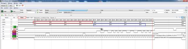 下图是Waveforms中整个QSPI的传输过程。注意图中采样信号的短暂中断,从这个时候起时钟频率由5.4MHz变为了25MHz。