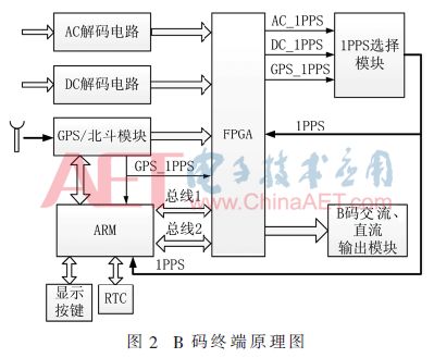 B码终端可同时接收GPS/北斗信号和外来B码信号。当GPS/北斗信号到来时,GPS/北斗模块通过天线接收授时信号,向ARM和FPGA发送1PPS脉冲信号,同时以串行方式向ARM发送时间信息;ARM将解出的时间信息及有效标志,通过自定义总线和通信协议发送至FPGA; FPGA在接收到1PPS与时间信息后,根据信息的有效性决定选用该时间信息或自守时的方式,生成多路AC/DC码和1PPS信号向外输出。当外来B码到来,通过AC/DC解码电路,将外来B码信号整形运放,然后传给FPGA进行编解码。