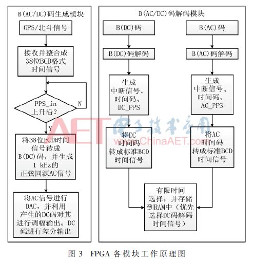 FPGA作为B码终端的核心,实现了时码产生、同步分频、外来B码信号解码等功能,主要包含B(AC/DC)码生成模块、B(DC)码解码模块、B(AC)码解码模块等。各模块工作原理如图3所示。