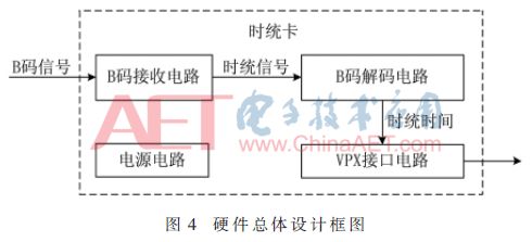 时统卡硬件总体主要包括B码接收电路、VPX接口电路、B码解码电路和电源电路。具体硬件结构设计框图如图4所示。