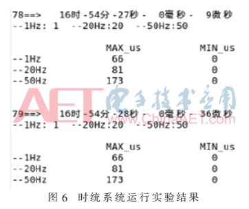 将B码终端与时统卡相连接,在接入GPS/北斗信号条件下,采用上位机对时统卡输出的信号进行读取。在读取过程中,为了显示直观性与简洁性,只在每秒初始时刻打印一次信息。另外,为了更加准确地反映时统系统及上位机读取的延时,上位机测试软件中加入了每秒读取时各个中断的最大及最小延迟。图6为时统系统运行实验结果。