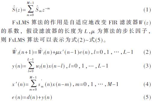 图1中W(z)代表FIR滤波器,P(z)代表初级声通道,S(z)代表从次级噪声数模转换到传声器采集到音频数据之间的次级声通道,[8],为了补偿次级声通道的影响,FxLMS算法需要得到次级声通道S(z)的M阶FIR估计 。假设次级声通道是时不变系统,则可以采用离线辨识的方法。图1中虚线框内即为系统所采用的离线辨识模块。稳定后得到次级声通道的传递函数为: