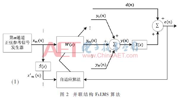在实际中,窄带噪声往往还包括其基频的高次谐波或者其他能量较高的频率分量。为了解决这个问题,可以使上一节中的正弦信号发生器包含多个对应的频率分量,这样做的优点是算法结构简单、资源消耗低。但同时会带来一个严重的问题,即当噪声中各频率分量差距较大时,同一个步长因子μ无法使所有频率达到最佳的收敛状态,会产生振荡或者不收敛的情况。而当各频率分量差距较小时,就需要自适应滤波器的阶数足够长,以满足相邻频率的高分辨率,这会导致收敛速度慢、量化误差大等问题[2]。所以,解决这个问题最好的办法是单独处理各个频率分量,即采用并联结构的FxLMS算法。算法结构如图2所示。