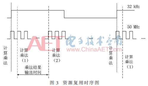 考虑到系统中FPGA的工作时钟为50 MHz,而音频模块的采样时钟为32 kHz,满足系统时钟频率远大于数据时钟频率的条件。所以采用将同一时刻并行进行的乘法运算部分转换为串行计算的方法对乘法器进行复用,即所谓的时间复用。时间复用的时序过程如图3所示。
