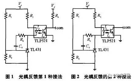 通常选择TL431结合TLP521进行反馈。这时,TL431的工作原理相当于一个内部基准为2.5V的电压误差放大器,所以在其1脚与3脚之间,要接补偿网络。常见的光耦反馈第1种接法,如图1所示。图中,Vo为输出电压,Vd为芯片的供电电压。com信号接芯片的误差放大器输出脚,或者把PWM芯片(如UC3525)的内部电压误差放大器接成同相放大器形式,com信号则接到其对应的同相端引脚。注意左边的地为输出电压地,右边的地为芯片供电电压地,两者之间用光耦隔离。图1所示接法的工作原理如下:当输出电压升高时,TL431的1脚(相当于电压误差放大器的反向输入端)电压上升,3脚(相当于电压误差放大器的输出脚)电压下降,光耦TLP521的原边电流If增大,光耦的另一端输出电流Ic增大,电阻R4上的电压降增大,com引脚电压下降,占空比减小,输出电压减小;反之,当输出电压降低时,调节过程类似。常见的第2种接法,如图2所示。与第1种接法不同的是,该接法中光耦的第4脚直接接到芯片的误差放大器输出端,而芯片内部的电压误差放大器必须接成同相端电位高于反相端电位的形式,利用运放的一种特性——当运放输出电流过大(超过运放电流输出能力)时,运放的输出电压值将下降,输出电流越大,输出电压下降越多。因此,采用这种接法的电路,一定要把PWM芯片的误差放大器的两个输入引脚接到固定电位上,且必须是同向端电位高于反向端电位,使误差放大器初始输出电压为高。