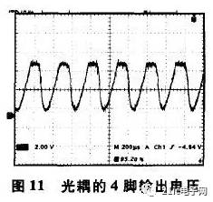 对于第2种接法,一般芯片内部的电压误差放大器,其最大电流输出能力为3mA左右,超过这个电流值,误差放大器输出的最高电压将下降。所以,该接法中,如果电源稳态占空比较大,那么电流Ic比较小,其值可能仅略大于3mA,对应图7,Ib为2mA左右。由图6可知,Ib值较小时,微小的Ib变化将引起Ic剧烈变化,光耦的增益非常大,这将导致闭环网络不容易稳定。而如果电源稳态占空比比较小,光耦的4脚电压比较小,对应电压误差放大器的输出电流较大,也就是Ic比较大(远大于3mA),则对应的Ib也比较大,同样对应于图6,当Ib值较大时,对应的光耦增益比较适中,闭环网络比较容易稳定。同样,对于上面的半桥辅助电源电路,用接法2代替接法1,闭环不稳定,用示波器观察光耦4脚电压波形,有明显的振荡。光耦的4脚输出电压(对应于UC3525的误差放大器输出脚电压),波形如图11所示,可发现明显的振荡。这是由于这个半桥电源稳态占空比比较大,按接法2则光耦增益大,系统不稳定而出现振荡。