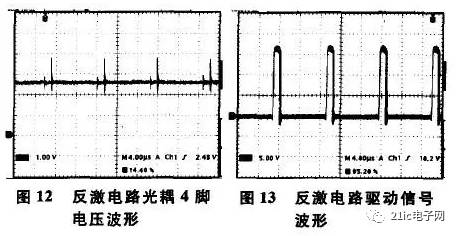 实际上,第2种接法在反激电路中比较常见,这是由于反激电路一般都出于效率考虑,电路通常工作于断续模式,驱动占空比比较小,对应光耦电流Ic比较大,参考以上分析可知,闭环环路也比较容易稳定。以下是另外一个实验反激电路,工作在断续模式,实际测得其光耦4脚电压波形,如图12所示。实际测得的驱动信号波形,如图13所示,占空比约为0.2。