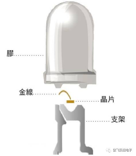 LED的基本架构如上图,只要在LED的两个管脚上添加正确的电压,LED就可以发光,那么应该在LED管脚上添加多少伏电压呢?